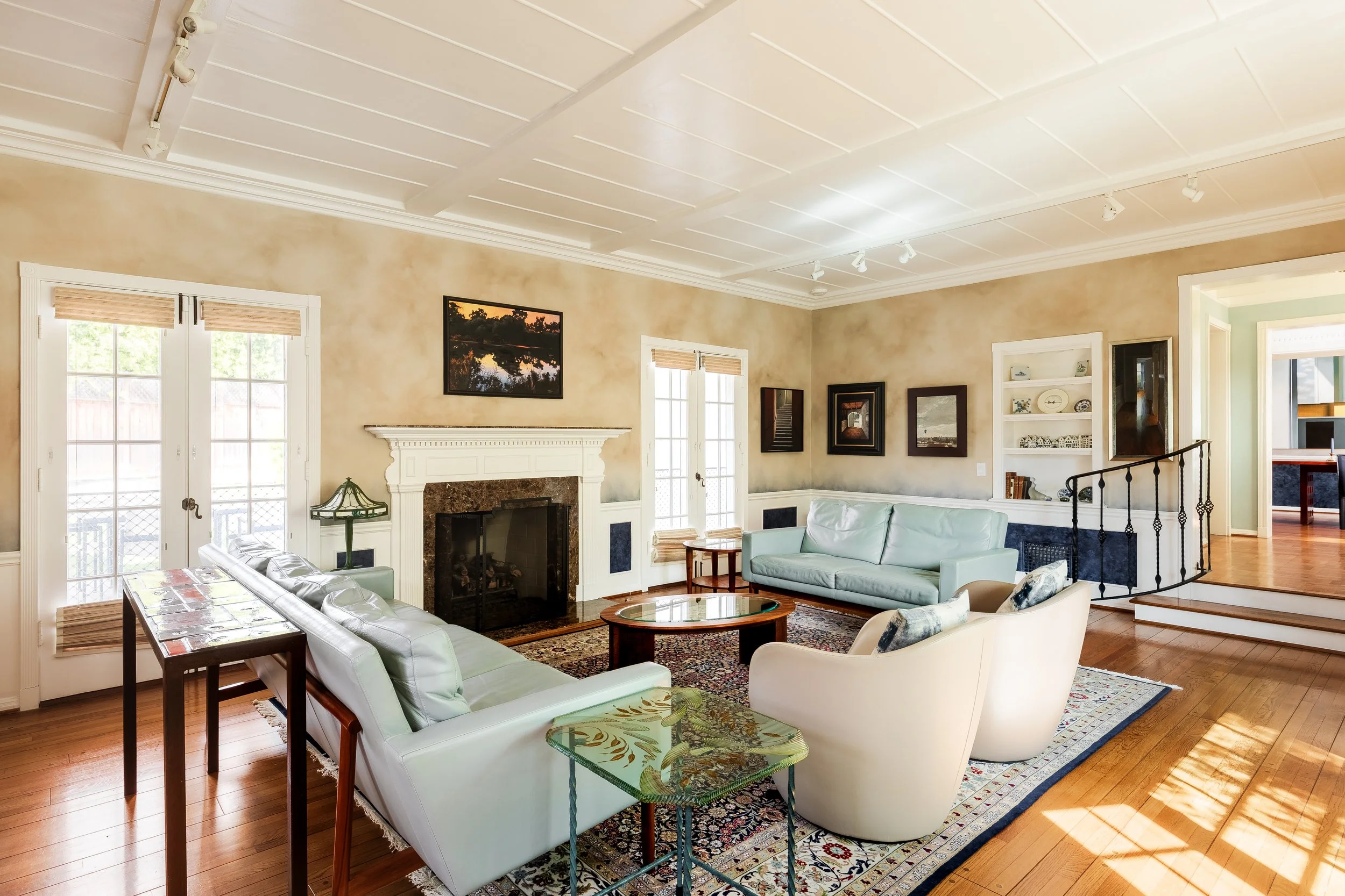 The gracious entry welcomes you to a step-down living room with decorative fireplace and French doors that open to the picturesque backyard. Formal dining room. The 2019 remodeled kitchen includes a breakfast nook lined with large windows and front facing view; Miele appliances, updated cabinetry and stone countertops; Stacked washer/dryer.